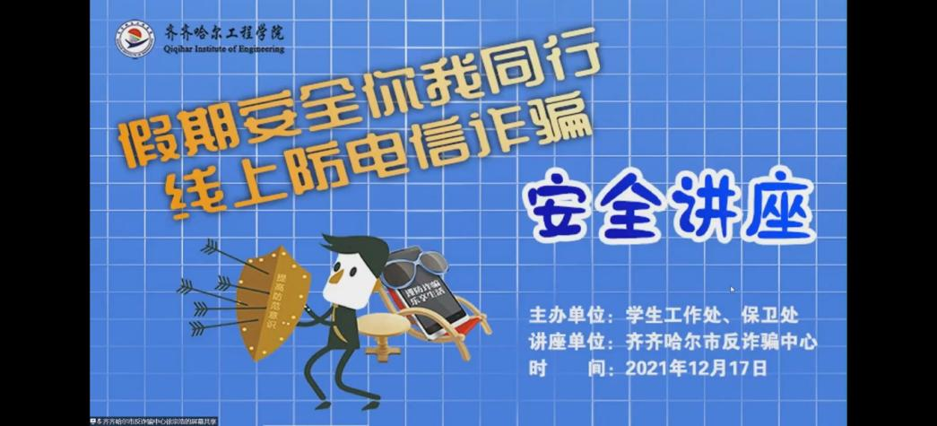 为进一步加大校园防诈骗宣传力度,普及反诈骗知识,增强学生的法治观念和安全防范意识,12月17日17点半,学校开展“假期安全你我同行,线上防电信诈骗”专场安全讲座。此次活动由学生工作处、保卫处联合举办,特邀齐齐哈尔市反诈骗中心民警徐宗浩警官主讲,全体在校生在线参会。会议由学生工作处副处长郭明敬主持。