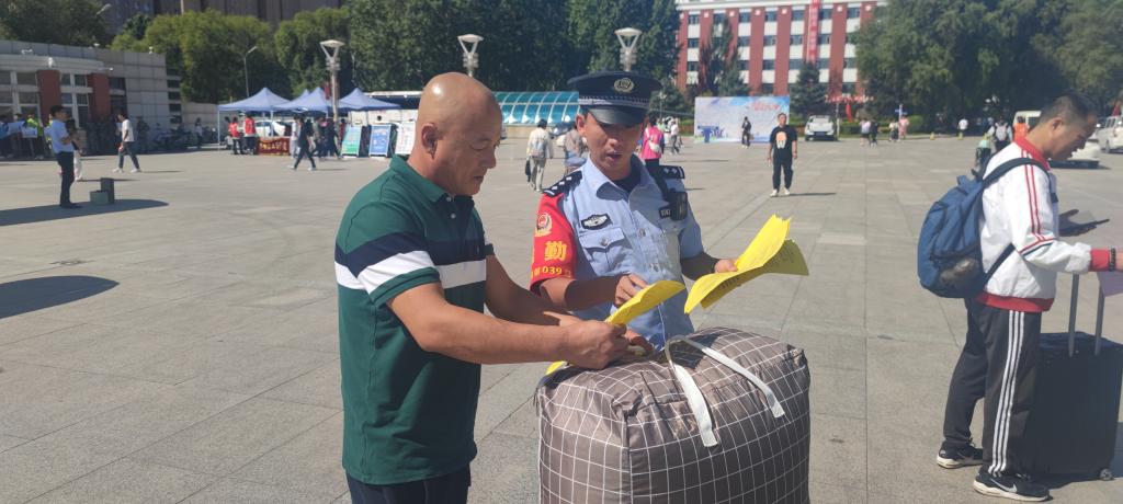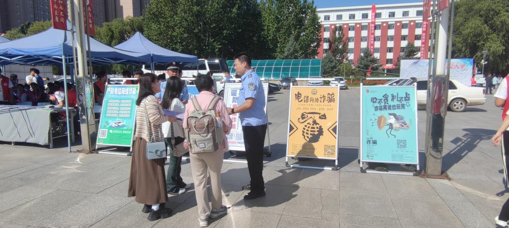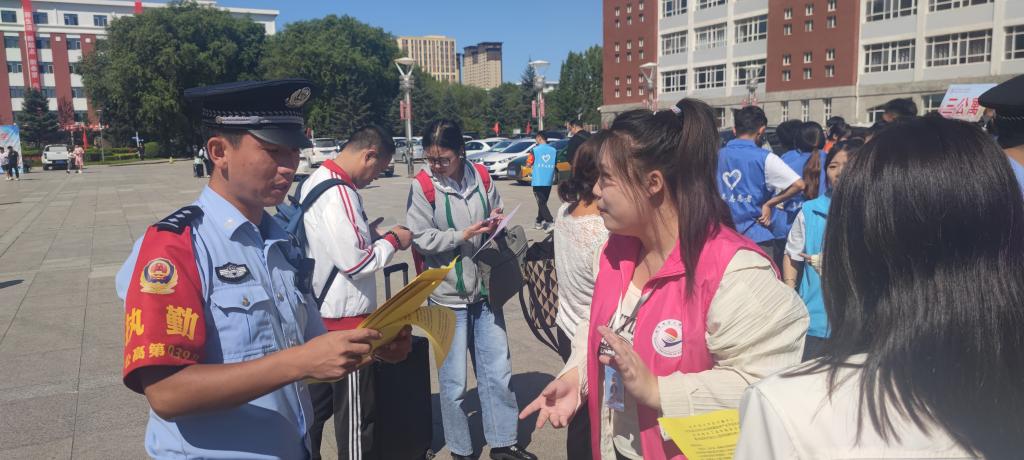 8月27日,2023级新生报道期间,学校保卫人员为新生及家长发放“反电诈”宣传单。
